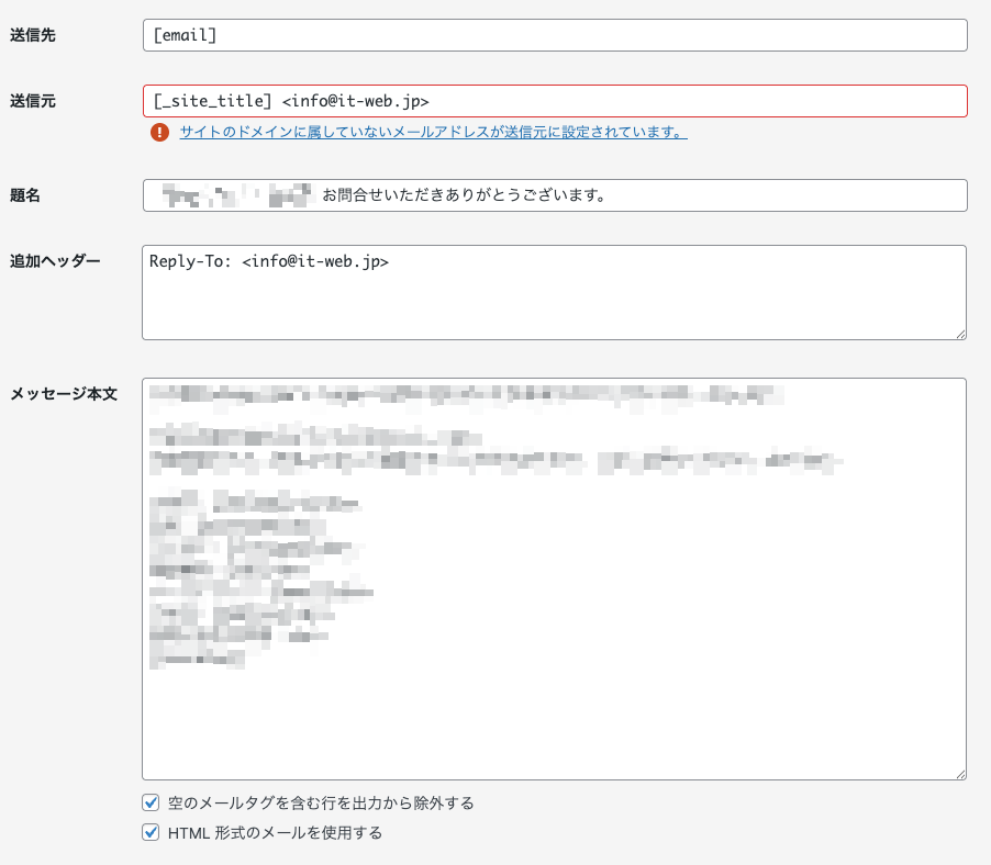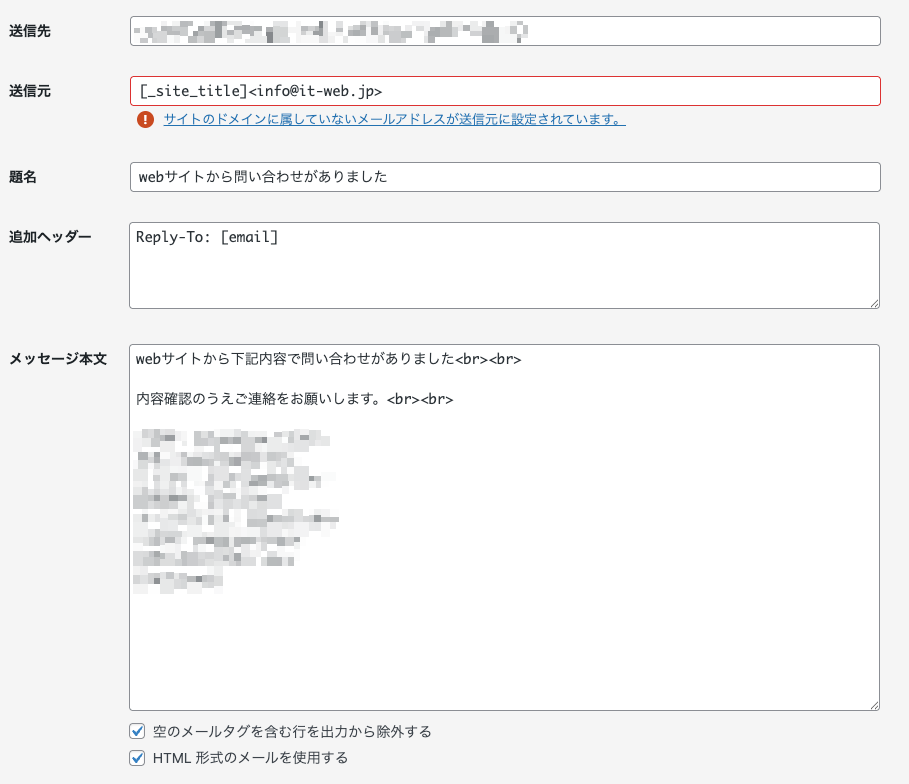 これを避けるために公開サイトと同じドメインのアドレスを取得し設定しましょう(例:info@ドメイン.jp)。正直これだけやっていればOKな感覚です。